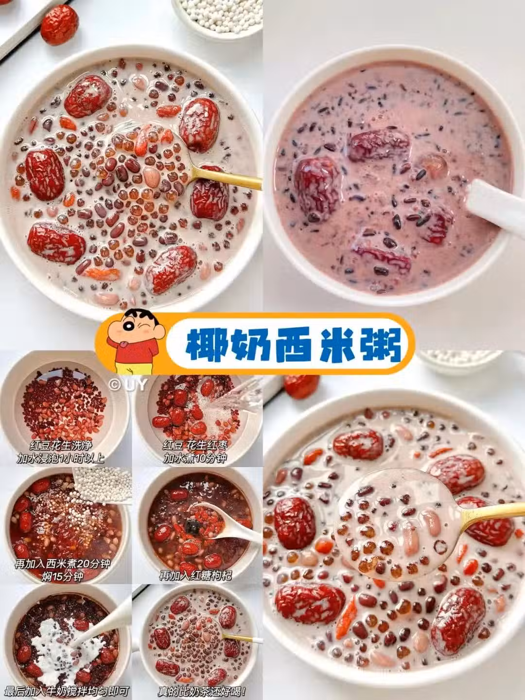 紅豆、紅糖、紅棗、枸杞、紅皮花生、西米、牛奶