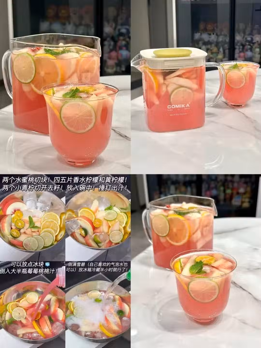 水蜜桃、香水檸檬、小青檸🍋🟩、薄荷葉、雪碧、莓莓桃桃汁、冰塊