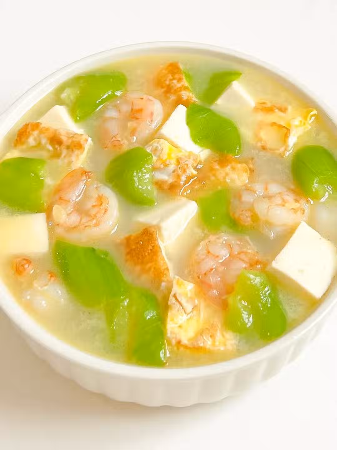 蝦仁和豆腐都是高蛋白、低脂肪的好東西,補鈣效果沒得說,對小朋友長高發育特別有幫助。絲瓜保護孩子脾胃,消化更好,煎蛋又能夠幫助鈣吸收。一碗湯下去,全是營養,孩子長高高。