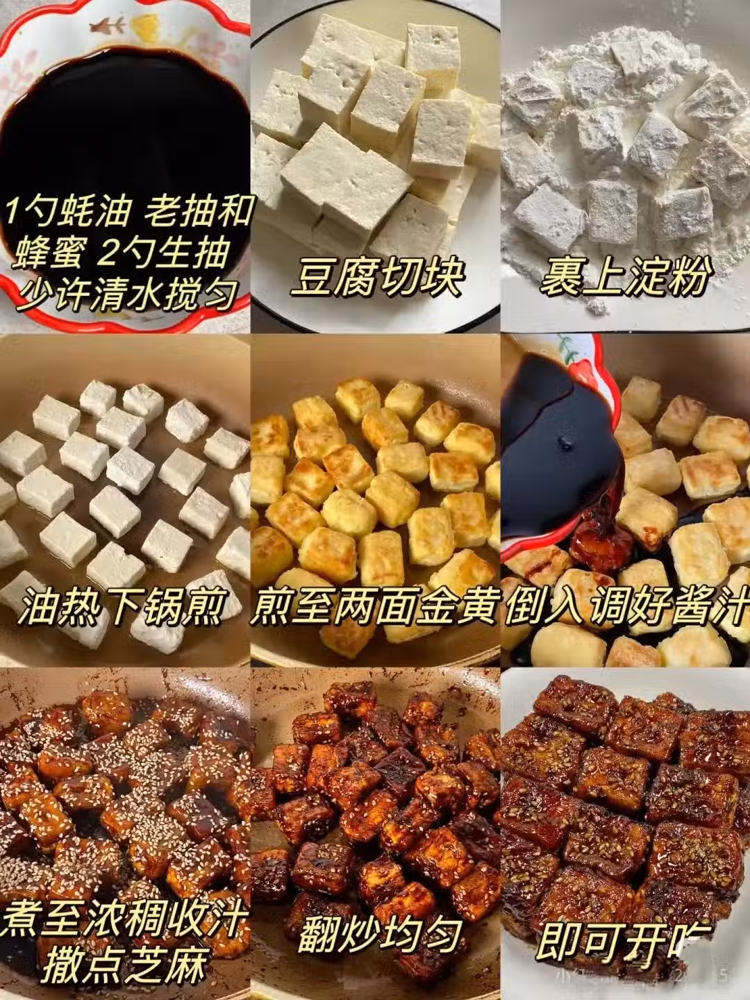 將調好的醬汁倒入鍋中,輕輕翻動豆腐,使每一塊都裹上濃郁的醬汁。待醬汁逐漸濃稠,豆腐充分吸收味道後,撒上一把芝麻,快速翻炒均勻。關火出鍋,一盤外酥里嫩、醬汁濃郁的芝麻醬汁豆腐就完成了。搭配米飯食用,絕對讓你好吃到停不下筷子。