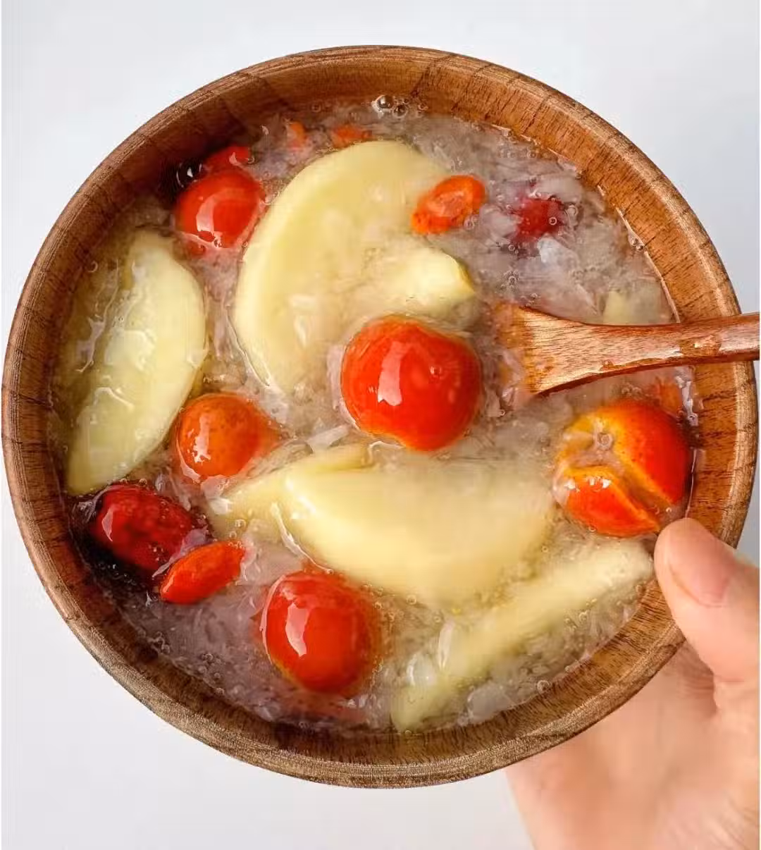 烹飪要點:① 銀耳先燉出膠質(約30分鐘)② 加蘋果山楂紅棗續煮20分鐘③ 冰糖枸杞最後5分鐘加入