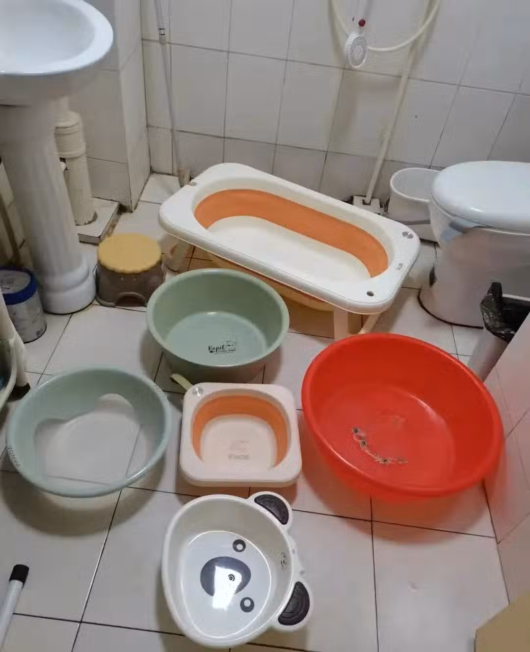 有條件的家庭,可以用定製浴室櫃給盆子留出空間,或者結合家務區,把盆子集中放在柜子里,最整潔清爽。