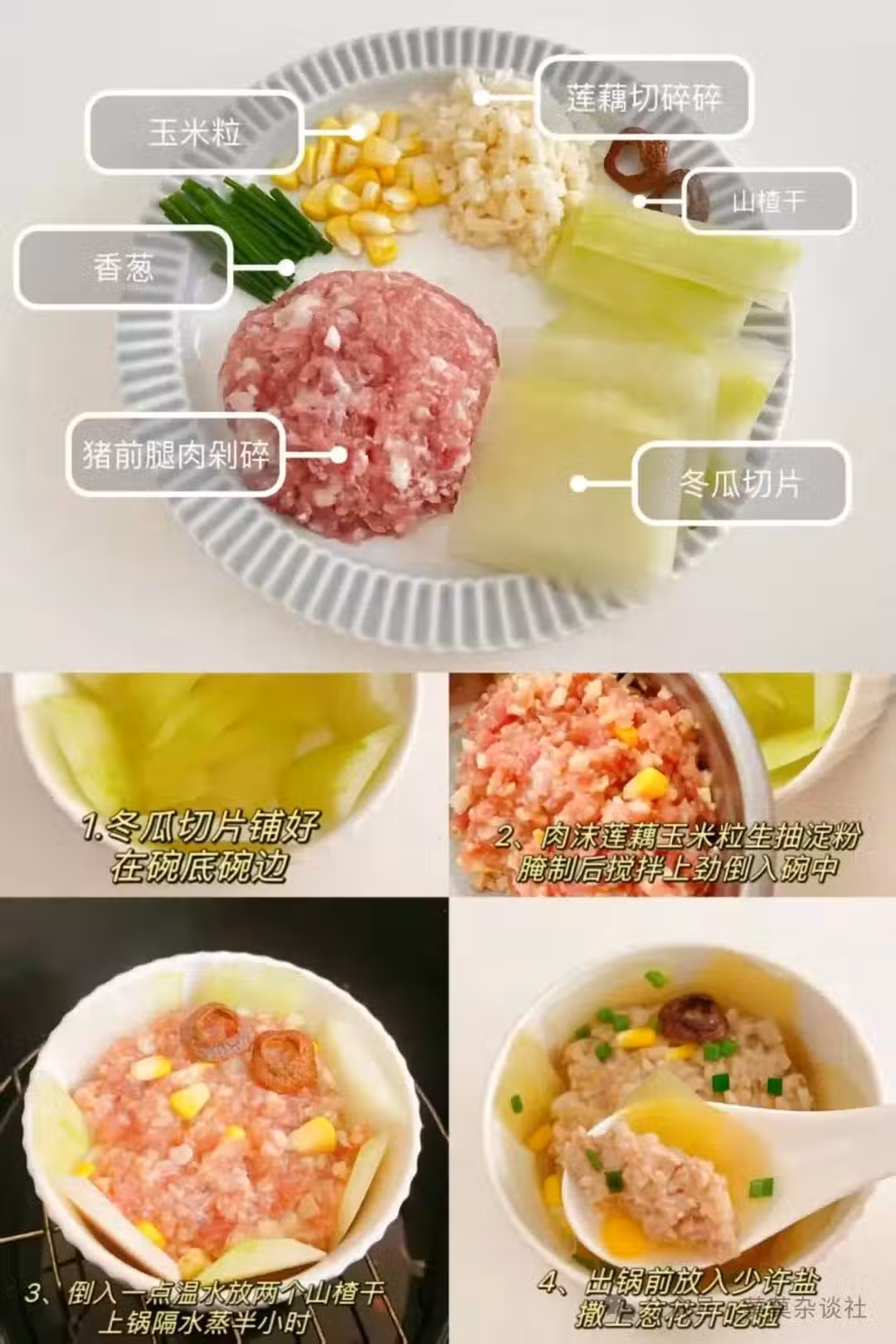 食材: 豬肉末 100g | 冬瓜 適量 | 蓮藕 適量 | 山楂干 2片 | 玉米粒 少許 | 香蔥 少許 | 鹽 少許