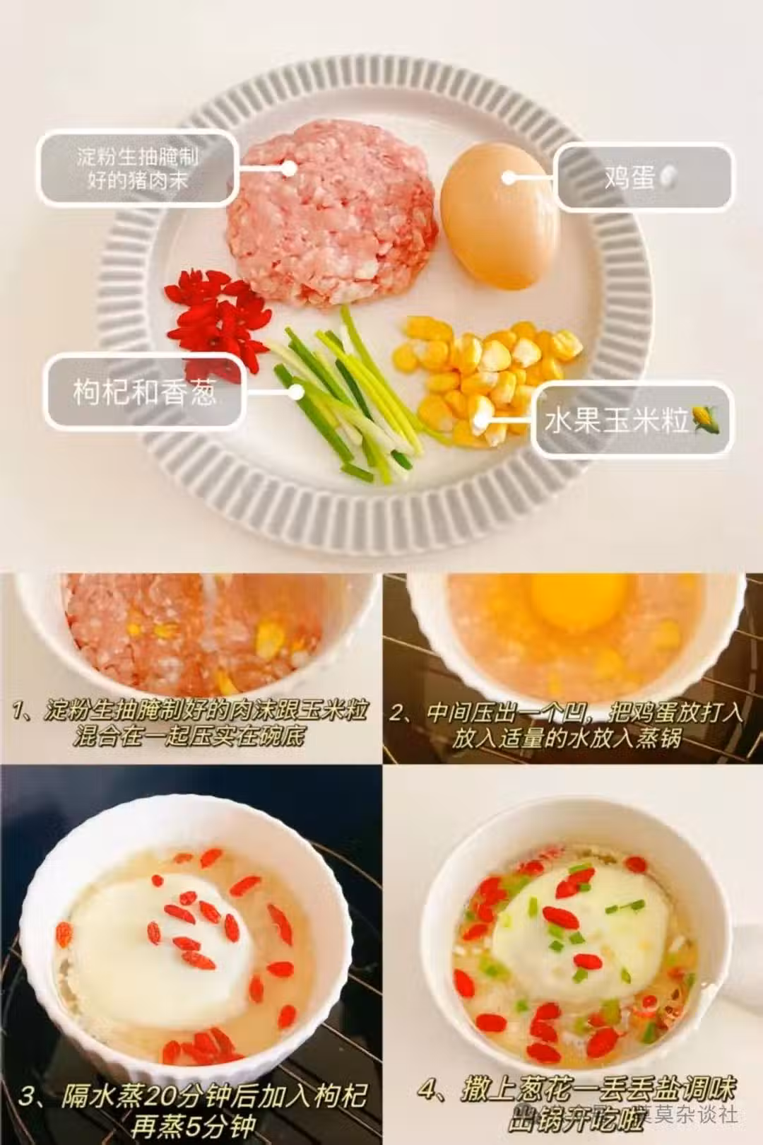 食材: 豬肉末 100g | 水果玉米粒 適量 | 雞蛋 1個 | 枸杞 適量 | 香蔥 少許 | 鹽 少許