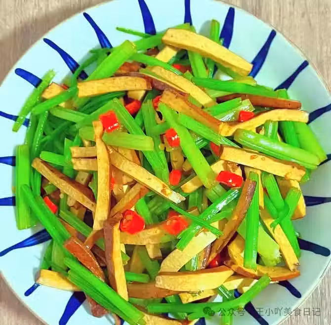 焯水:水中加鹽、油,水開下入芹菜汆燙,然後下入豆乾一起焯一下,撈出備用。