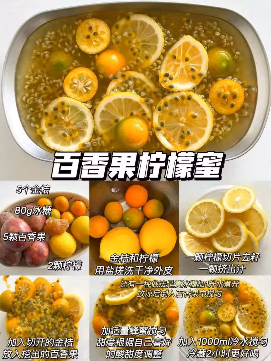 3️⃣金桔對半切塊,加入挖出的百香果、兩勺蜂蜜攪拌均勻,加入檸檬汁和檸檬片