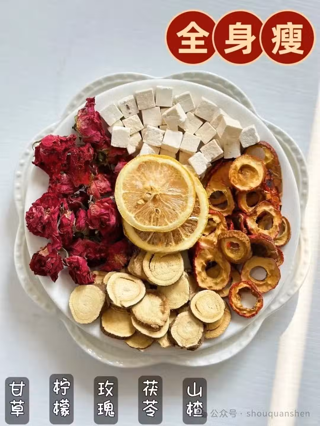 如果你想要全身都瘦,塑造勻稱身材,這款茶將是你的好選擇。檸檬能促進新陳代謝,茯苓幫助排水和清除體內濕氣,山楂和玫瑰則進一步調理你的消化系統,幫助脂肪分解,甘草還能調和其他藥材的作用,幫助你達成全身瘦的目標。
