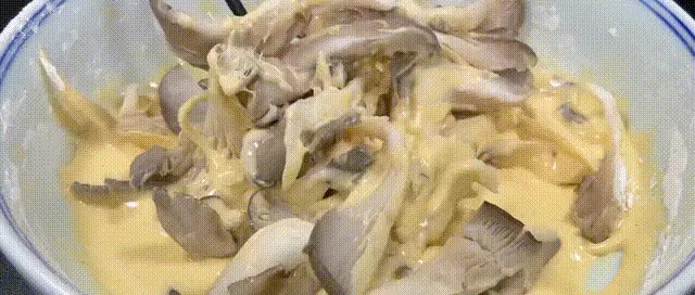 此時,鍋中倒入足量食用油,大火加熱至六成熱(筷子插入會冒密集小泡)。轉中火後,將裹好麵糊的蘑菇逐個下鍋,避免粘連。