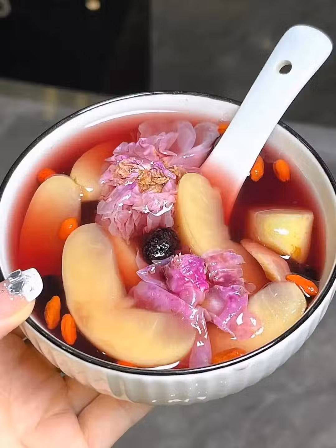 蘋果半個、桑葚6個、黃芪10克、玫瑰4朵、枸杞適量