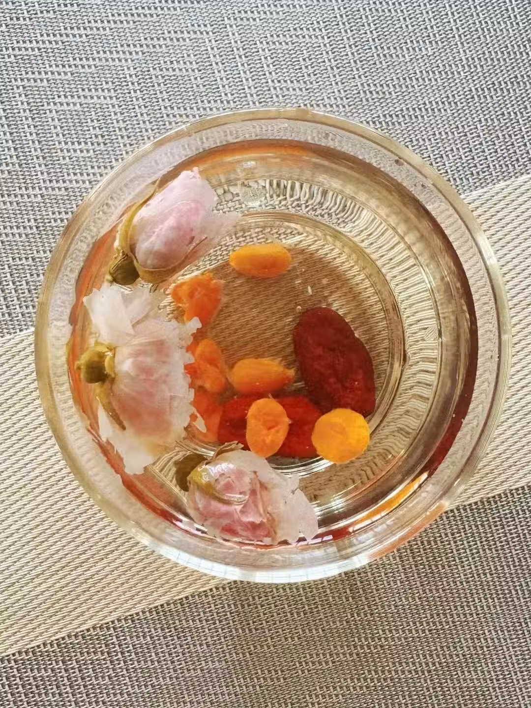 準備食材:紅棗 3 - 5 顆(紅棗切開泡效果比整顆好哦)、玫瑰花 3 - 5 朵、枸杞 10 - 20 顆。