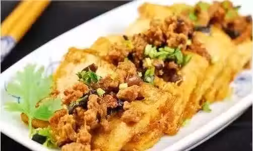 3、起油鍋,油溫7成熱時放入裹好生粉的豆腐片,煎至兩面金黃盛出備用。
