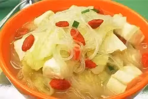食材:嫩豆腐一塊重約150克、粉絲一把、枸杞15克、素高湯(或清水)適量、白菜適量。