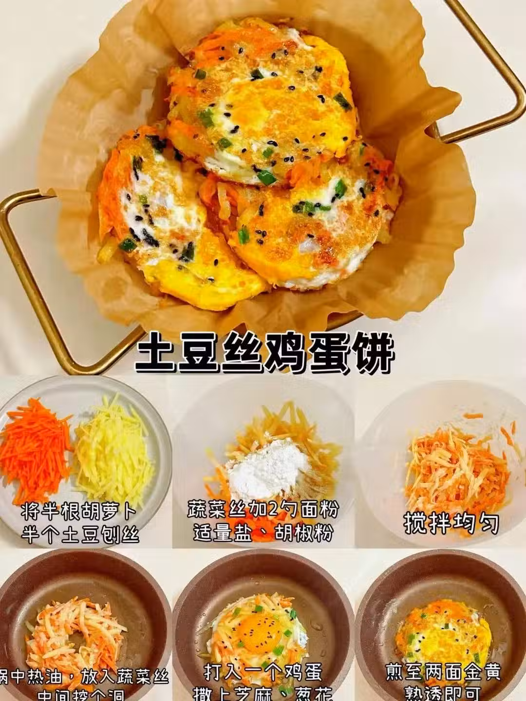 2. 土豆絲雞蛋餅:東北人的「糊弄學之光」 土豆胡蘿蔔擦絲+雞蛋+麵粉攪和勻,丟鍋里隨便一攤,3分鐘出鍋。 口感外脆內軟,土豆絲自帶微微甜,蘸點老乾媽,瞬間從「湊合吃」升級成「再來一盤」!懶人秘訣:擦絲器比老公好用,信我。