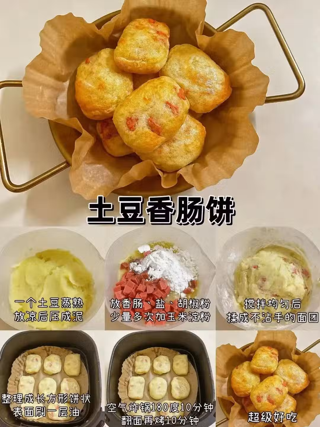 4. 土豆香腸餅:00後廚房首秀必選 土豆蒸熟壓成泥,拌上切碎的火腿腸,團成球再壓扁,煎到兩面焦香。 口感像在吃薯餅+肉腸的結合體,軟糯中帶點Q彈,隔壁大學生試了都說:「比食堂強了800個外賣平台!」