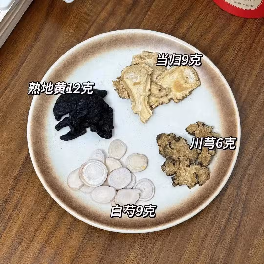 當歸9克、川芎6克、熟地黃12克、白芍9克