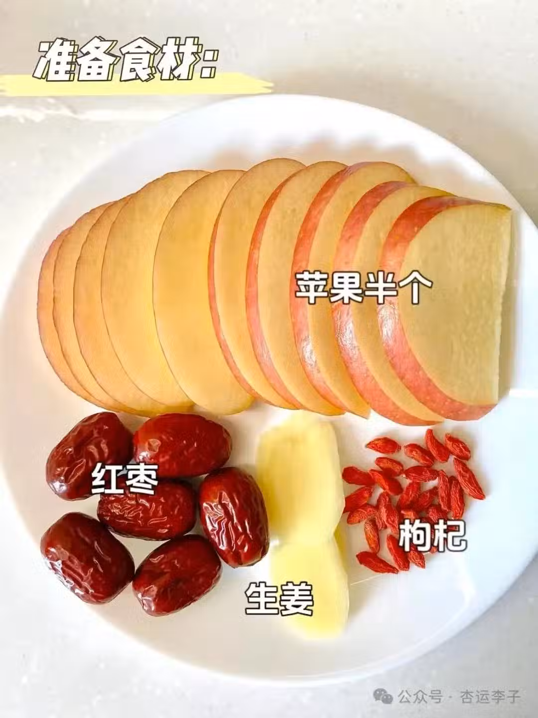 蘋果拿鹽搓洗後切片,姜切片或切絲,紅棗去核洗乾淨,所有材料放到鍋里,煮15分鐘,最後再加一小勺紅糖。