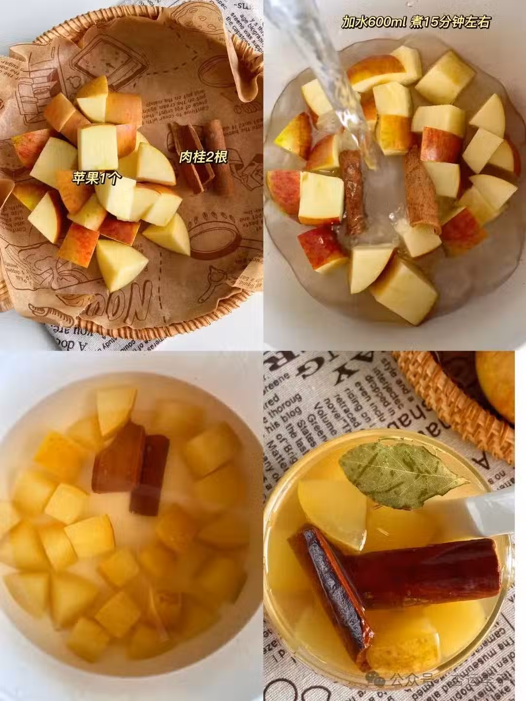 將蘋果連皮帶核切塊,和肉桂一起放入鍋里,煮15分鐘左右,最後加入適量紅糖,趁熱飲用。
