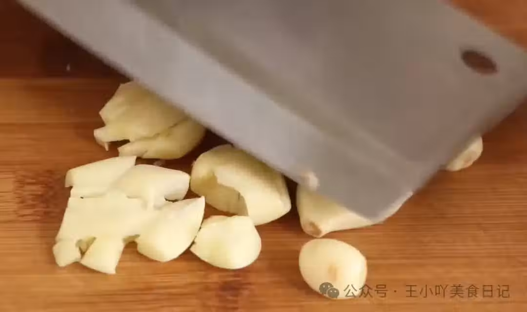 大蒜是這道菜的提味關鍵。將大蒜去皮後壓扁,再切碎一點,放在一旁備用。