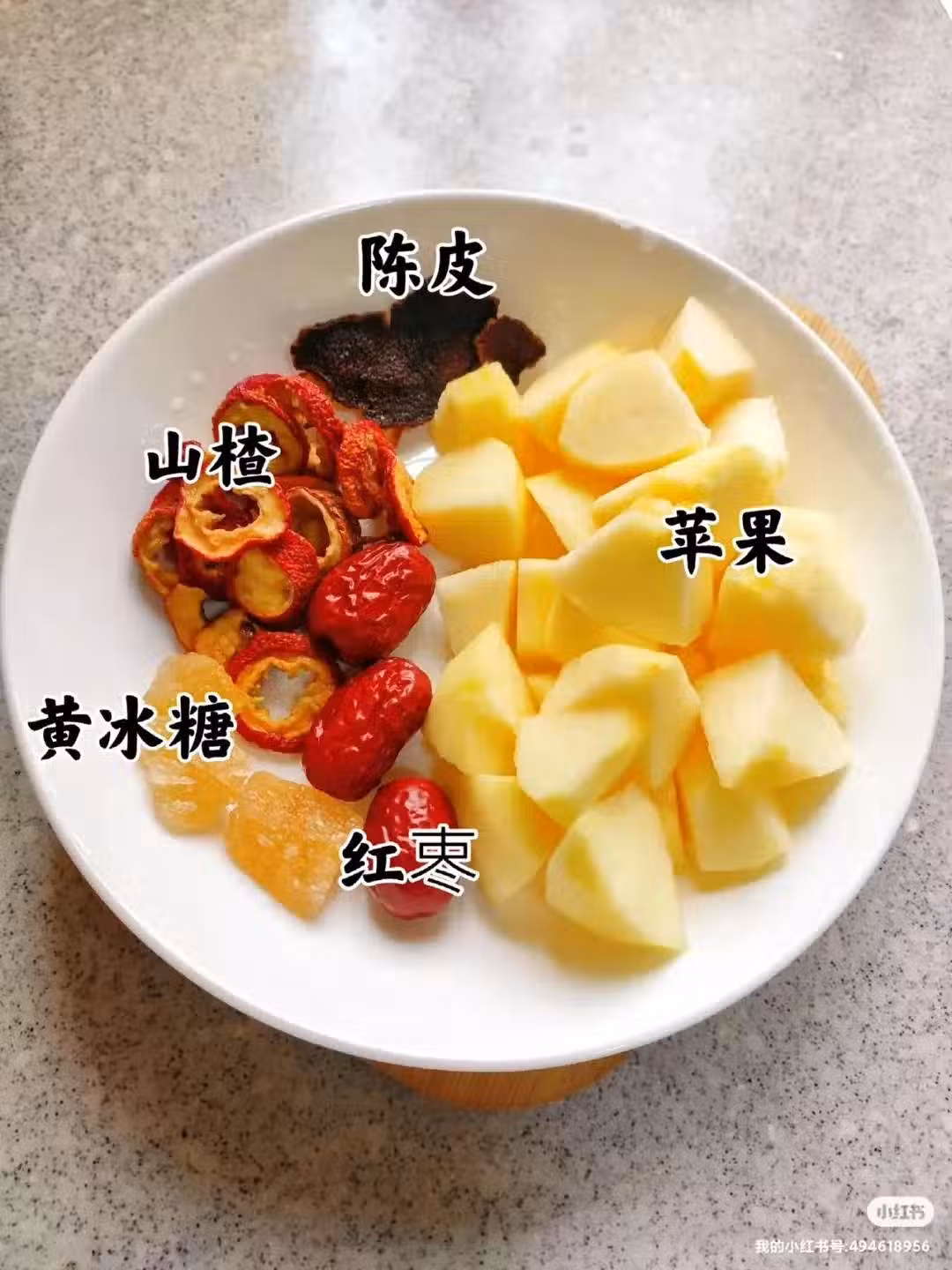 食材:蘋果1個,紅棗3個,山楂干四五片,陳皮一塊,適量冰糖。