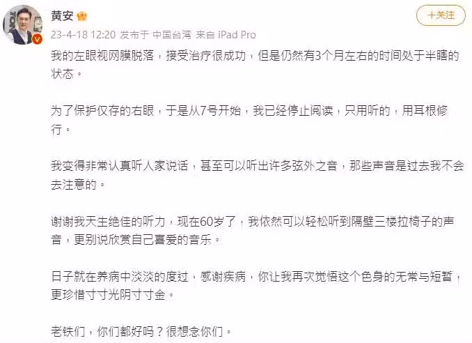 雖然病了,黃安仍感謝自己已經60歲,還能擁有絕佳聽力,並表示最近的日子都在養病中度過。