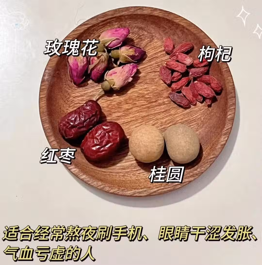 玫瑰5朵 , 紅棗3顆 ,桂圓肉5g , 枸杞5g