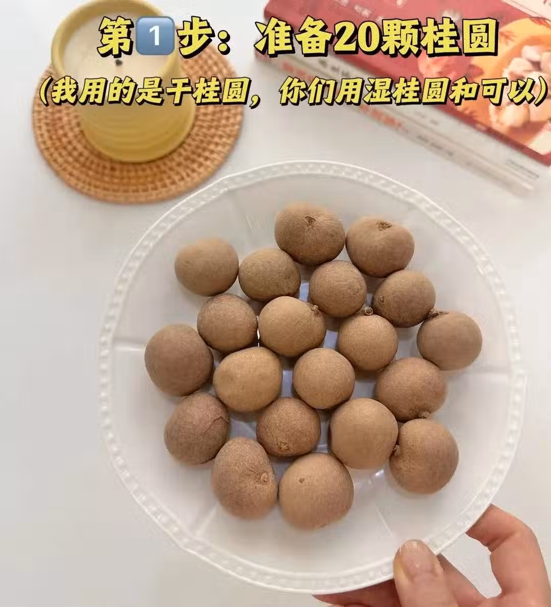 懶人養生法:取8-10顆帶殼桂圓洗凈,冷水下鍋煮沸後轉小火燜15分鐘,湯色琥珀透亮時關火。晨起空腹飲用效果最佳,可搭配玫瑰/枸杞增加風味。