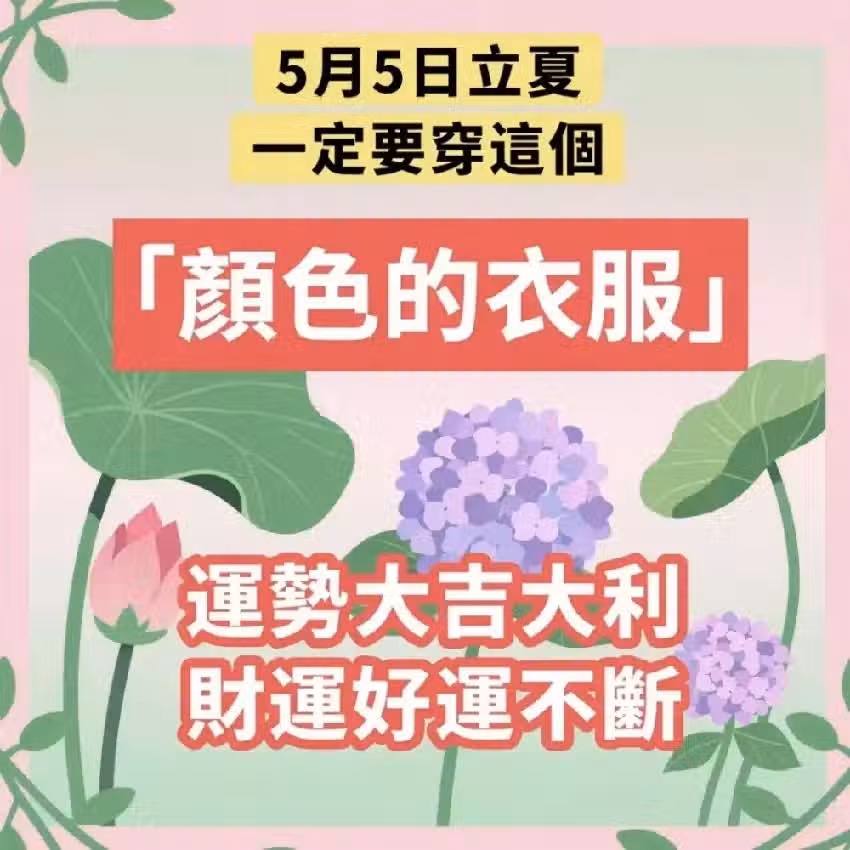 一年之中有24個節氣,而「立夏」就是春夏交替的轉運大日子!在民俗與風水學中,立夏象徵陽氣漸旺、萬物成長、福氣翻倍的開始!若能在這天穿對顏色,就能為整個夏季打開好運的能量場,不僅財運滾滾來,感情、人緣、事業運也會同步旺起來!🔥