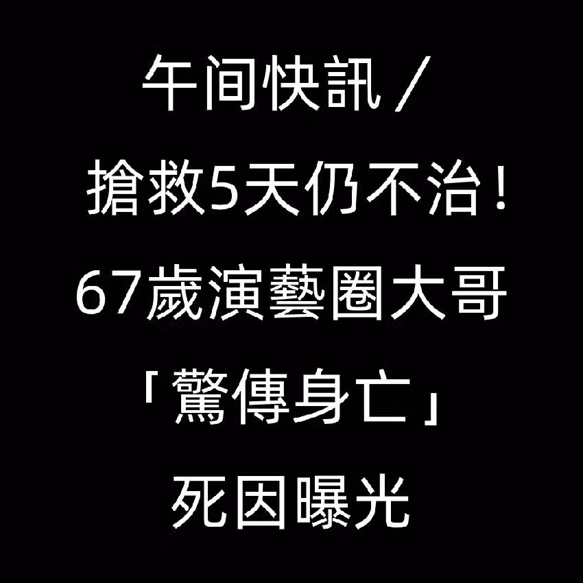 午間快訊/搶救5天仍不治!67歲演藝圈大哥「驚傳身亡」死因曝光