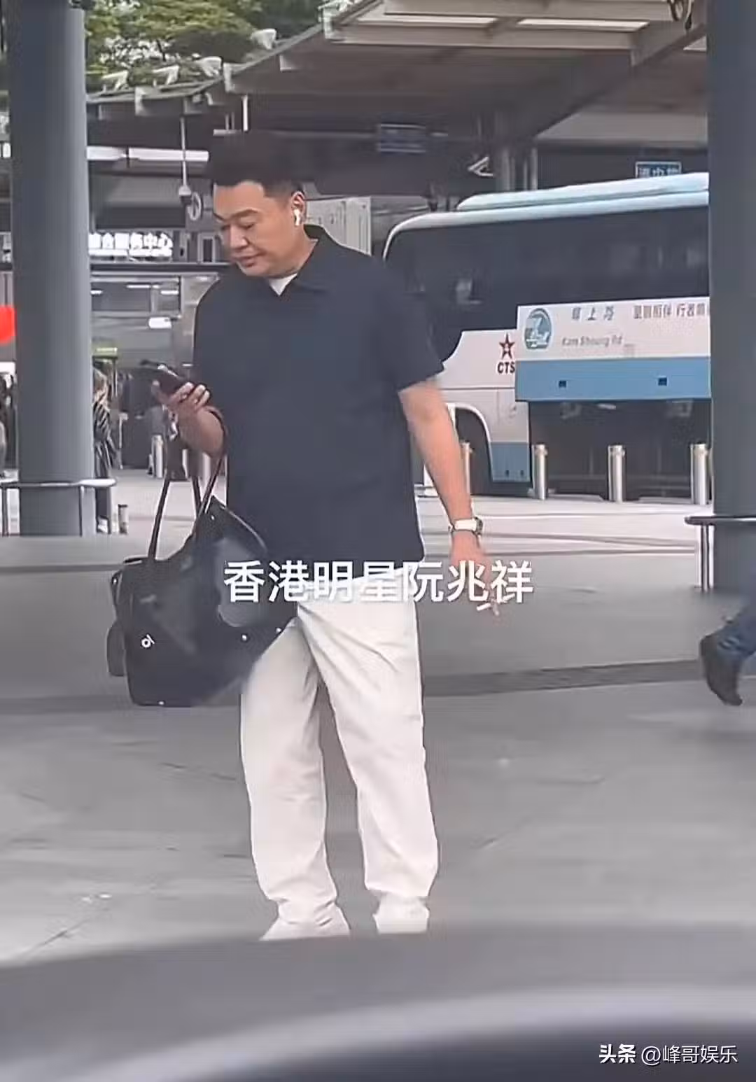 在曝光的視頻里,阮兆祥獨自站在人潮熙攘的跨境巴士站台。他身穿剪裁精緻的黑色 POLO 衫,搭配垂感極佳的米白色休閒褲,右手提著某奢侈品牌的經典款公文包,左手手指間香煙的青煙裊裊升起,