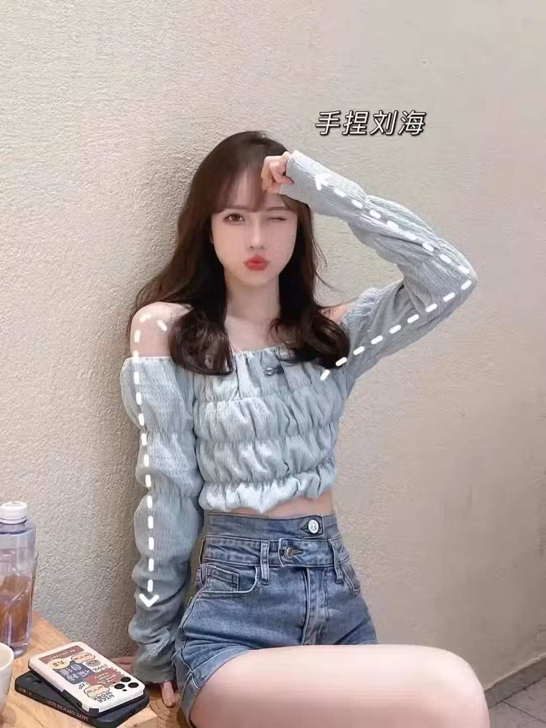 這個姿勢比較偏柔美風格。坐在地板上或座位上,腿部自然收攏,一隻手反手輕撫頭髮,表情帶著一點羞澀或者微笑,瞬間拉滿溫柔氛圍感,非常適合搭配小眾濾鏡或者膠片感調色,文藝風十足。