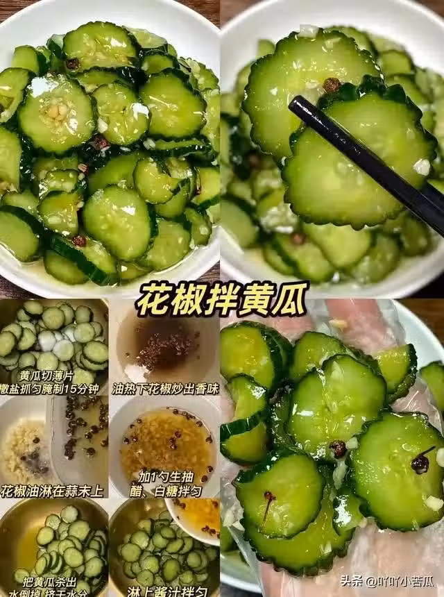 2. 熱油爆香花椒,濾出花椒油淋在黃瓜上,加1勺生抽+半勺醋+白糖拌勻!