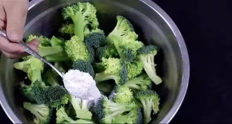 最後就是加水了,我們往盆里倒入沒過西蘭花的水,然後攪拌一下,使裡面的食鹽、