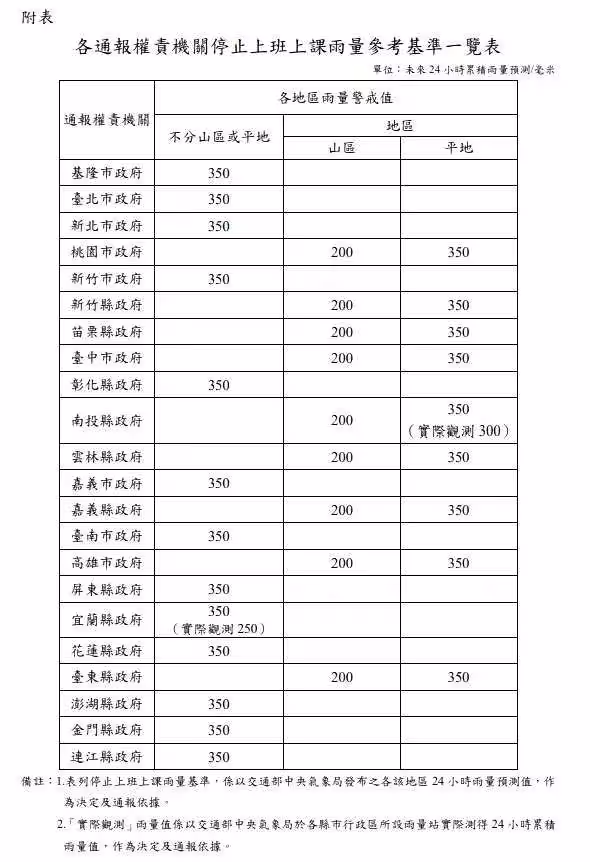 依據「天然災害停止上班及上課作業辦法」規定,若颱風暴風半徑4小時內可能經過,且平均風力達7級以上或陣風達10級以上,或24小時累積雨量預測達山區200毫米、平地350毫米(部分地區一律以350毫米為準),且已造成災情或有致災風險時,地方政府可視實際情況發布停班停課通知。