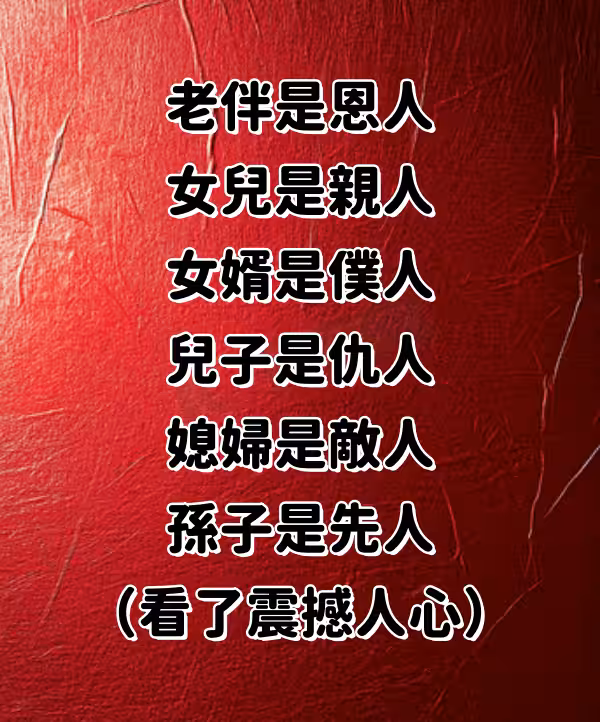 老伴是恩人,女兒是親人,女婿是僕人,兒子是仇人,媳婦是敵人,孫子是先人(看了震撼人心)