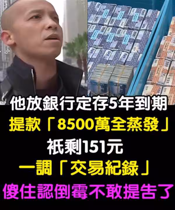 辛辛苦苦賺來的錢,就這樣沒了!一位男子將8500萬台幣存進銀行中,還設定了5年的定存,不料5年後他一回國,戶頭裡的錢不增反減,只剩下150元!他氣得找銀行理論,不料銀行卻撇清關係,最後經過調查,才發現原來有「內鬼」!