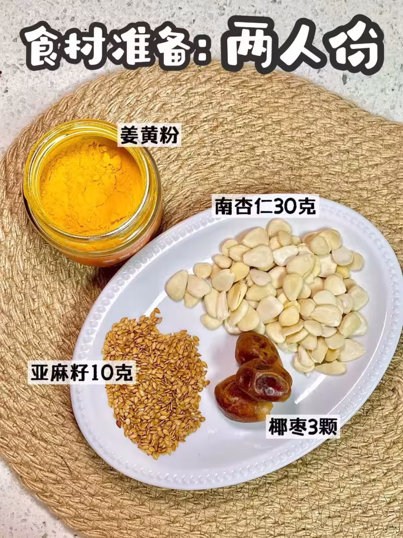 南杏仁和亞麻籽提前用清水泡軟,椰棗去核。所有材料放進破壁機,加一杯半水打成乳白色液體,過濾之後倒入杯子,撒一點薑黃粉點綴。