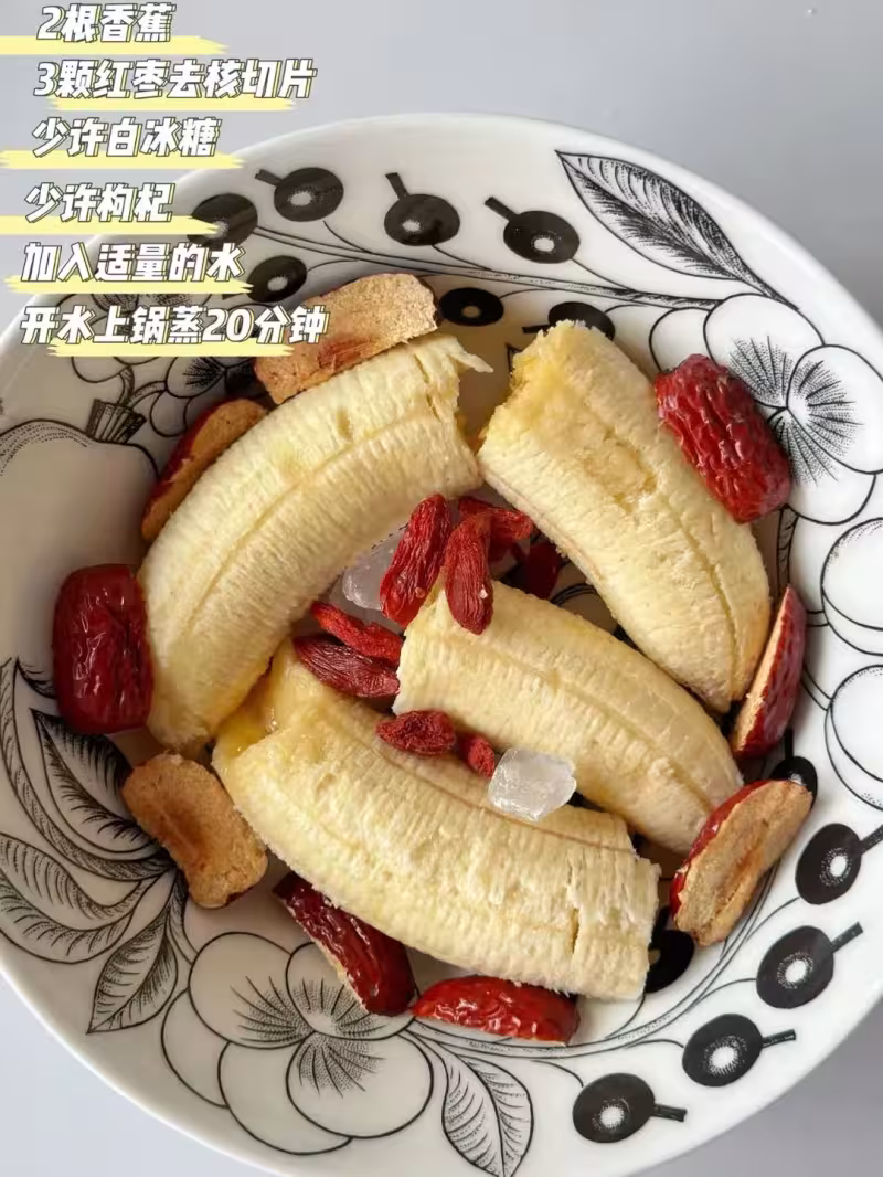 蒸好之後香蕉變得軟軟的,冰糖融化在水裡,帶著紅棗和枸杞的一點點甜味。我趁熱吃了一碗,身體暖暖的,人也覺得輕鬆了一些。這幾天晚上我都會蒸一點,吃起來不會膩,也挺方便的。