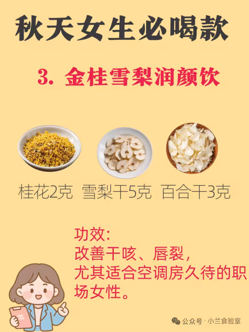 功效:桂花溫肺化飲,雪梨生津潤燥,百合滋陰安神。此方猶如「肌膚補水劑」,改善乾咳、唇裂,尤其適合空調房久待的職場女性。