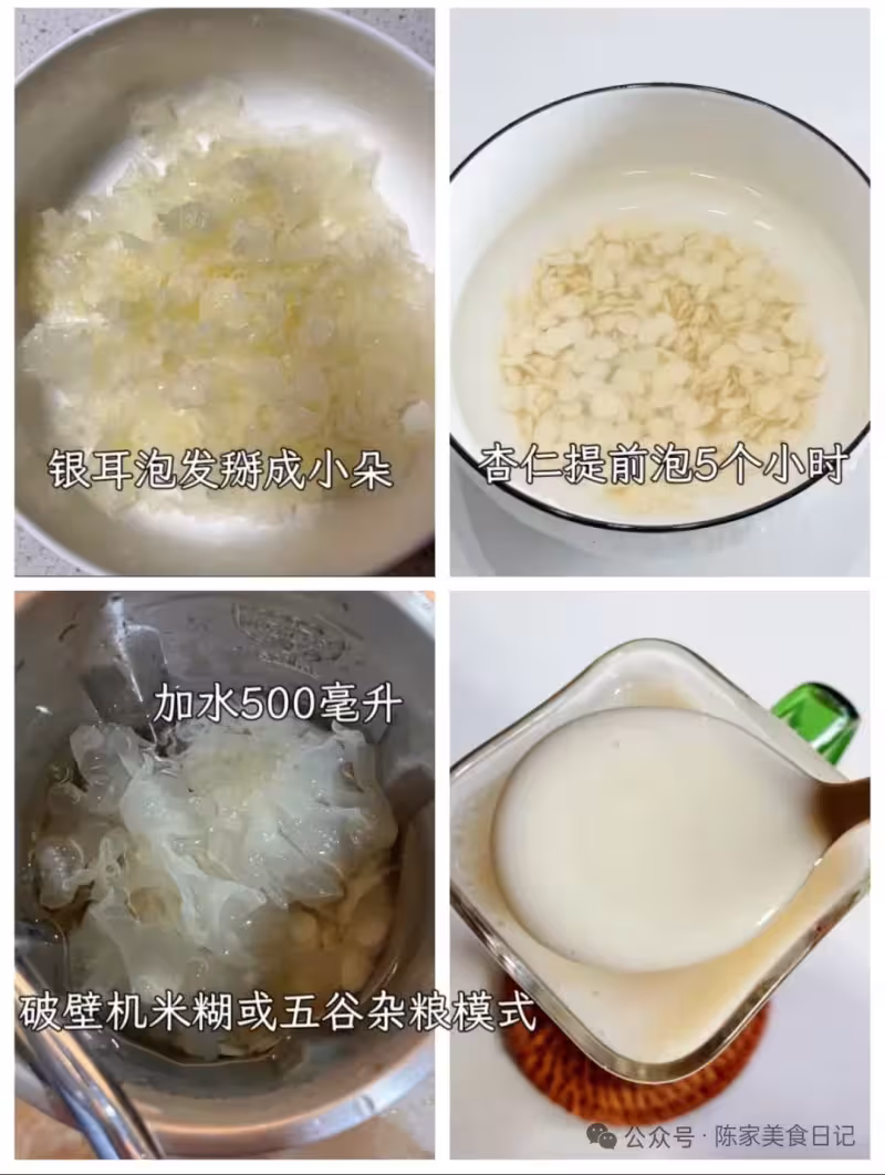 破壁機中放銀耳杏仁,選擇米糊或五穀模式。