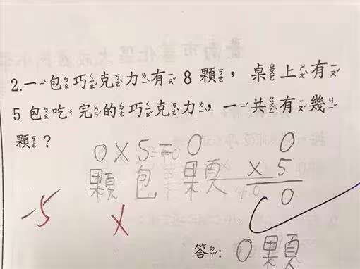 該題目為「一包巧克力有8顆,桌上有5包吃完的巧克力,一共有幾顆?」許多人一看到題目都會直觀以為老師是在考九九乘法,因此都會非常直觀地認為是8X5=40的答案,但老師卻打上一個叉,並寫上正確解答其實是0顆,因為題目中有特彆強調是「吃完的巧克力」,讓大批網友傻眼直喊根本是在考驗邏輯。
