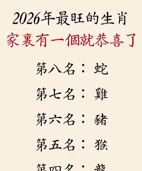 【本報訊】2026年腳步近,命理圈已提前公布「最旺生肖榜」!只要家裡有這幾個生肖,明年財運、事業、健康全面開掛,第八到第五名先揭曉,快來看看你家有誰上榜!