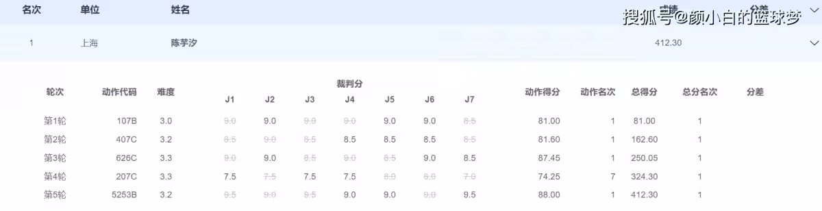 10米台預賽陳芋汐有一個較大的失誤,實際上決賽她也有失誤,這個失誤是207C動作,這個動作她只拿到74.25分排在第七的位置,但她其餘的4個動作都拿到第一,最終她還是斷崖領先。
