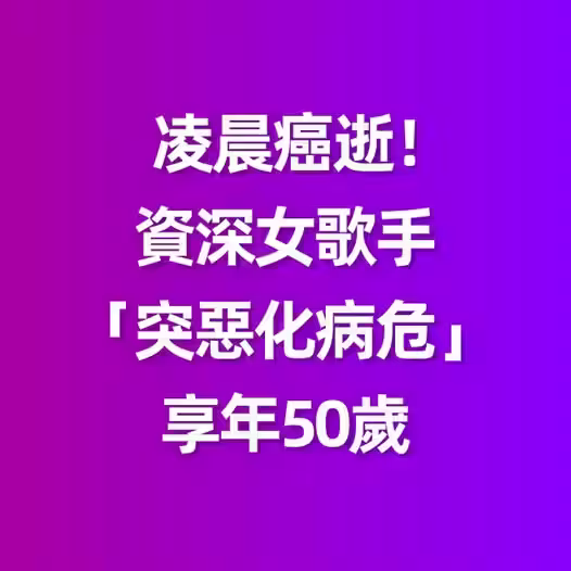 凌晨癌逝 !資深女歌手「突惡化病危」享年50歲 昔勇敢「公開坎坷經歷」丈夫悲慟:趕去還是來不及~