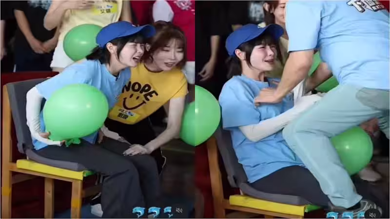 胡瓜玩坐氣球遊戲不小心摸到籃籃胸部,不過許多網友也緩頰說:「這一看就知道不是故意的。」