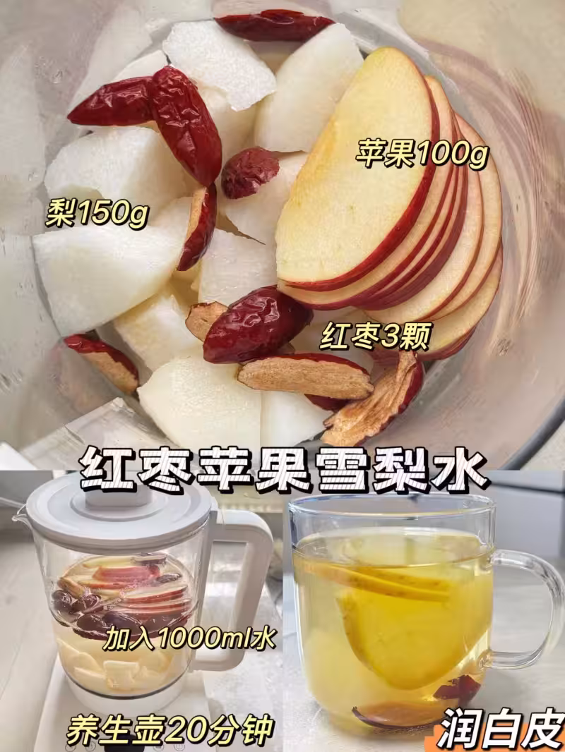 黃芪枸杞雪梨水:梨 150g+黃芪 5g+枸杞 5g+紅棗 4 顆+水 1000ml