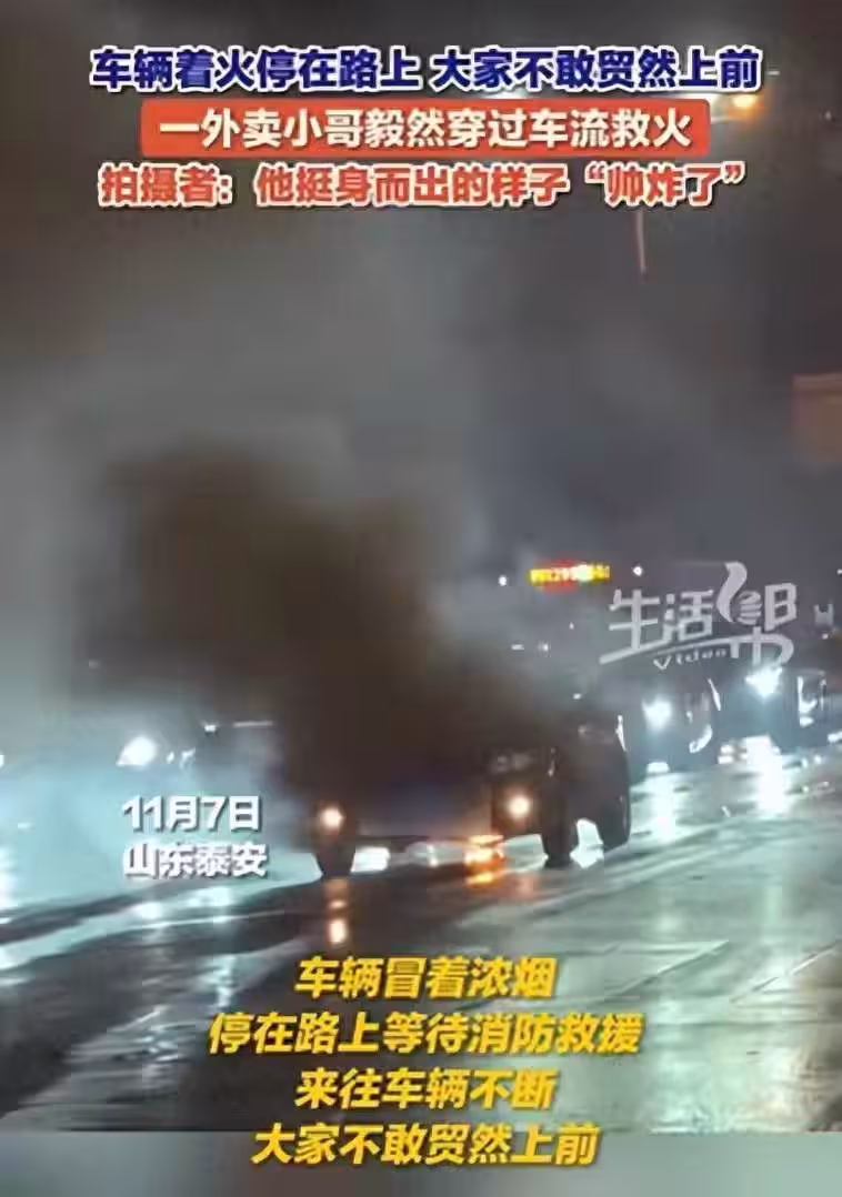 11月7號中午,泰安某商場附近一輛車突然起火,外賣小哥看見後跑去警務室借了兩個滅火器去幫忙滅火。