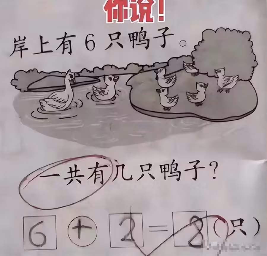 沒想到這次看到兒子作業本上一題:「岸上6隻鴨子,水中2隻,一共有幾隻?」她瞬間傻眼。