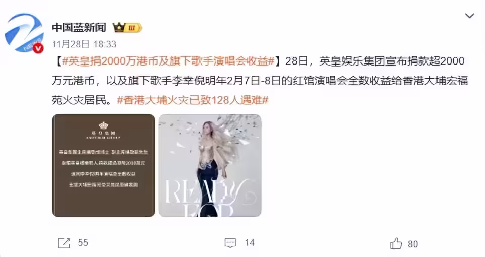其中,內地明星捐款人數和金額都要超過香港藝人,其中韓紅基金會捐出1000萬。
