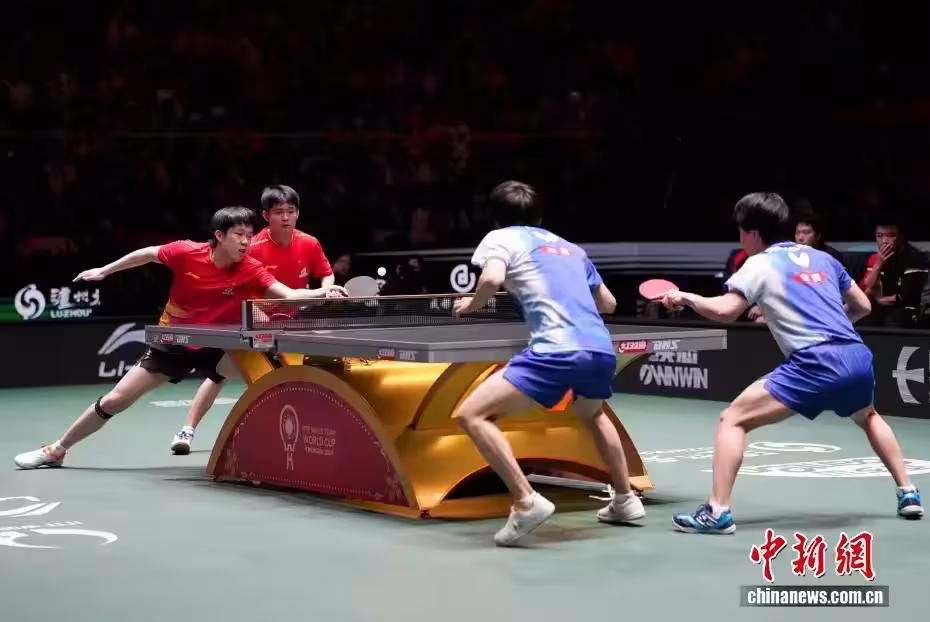 12月6日,四川成都,中國隊隊員王楚欽(左一)與林詩棟(左二)在男子雙打比賽中。當日,2025年成都國際乒聯混合團體世界盃第二階段比賽中,中國隊以8:5戰勝日本隊。
