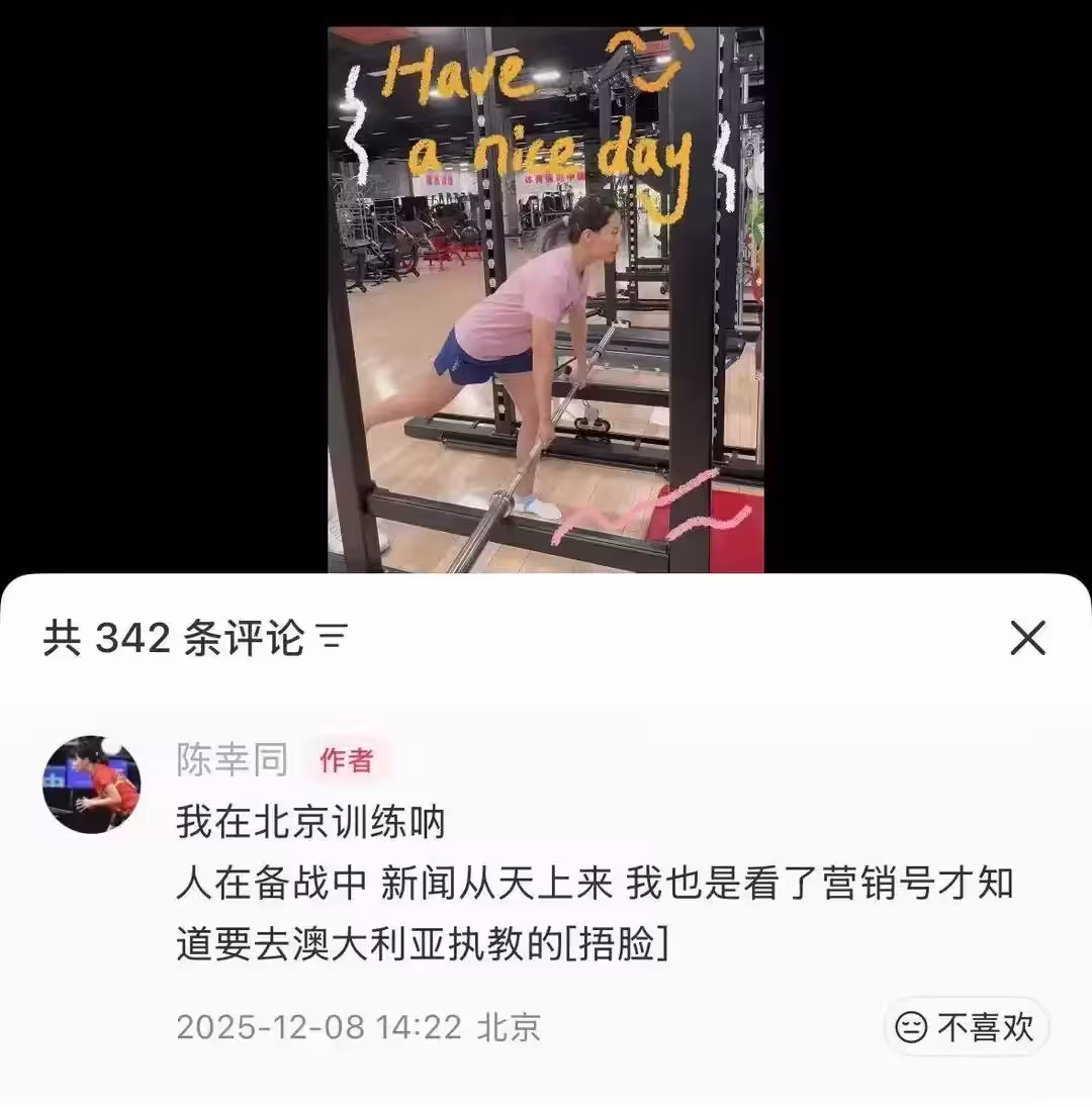 12月8日,中國桌球隊主力隊員陳幸同在社交平台發文,幽默回應「赴澳大利亞執教」的不實傳聞,一句「人在備戰中,新聞從天上來」引髮網友熱議,她還調侃自己是通過營銷號才得知這一消息,目前正於北京全身心投入訓練。